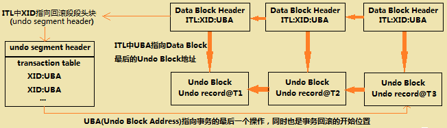 undo block 1和undo block 2是存在先后顺序的,并且新老undo块串联起来,新的undo块指向上一个老的undo块。因为写undo块的时候是从undo block 1写到undo block 2再写到undo block 3,当需要做rollback的时候,需要先回滚undo block3 ,再回滚undo block 2,最后才是undo block 1。