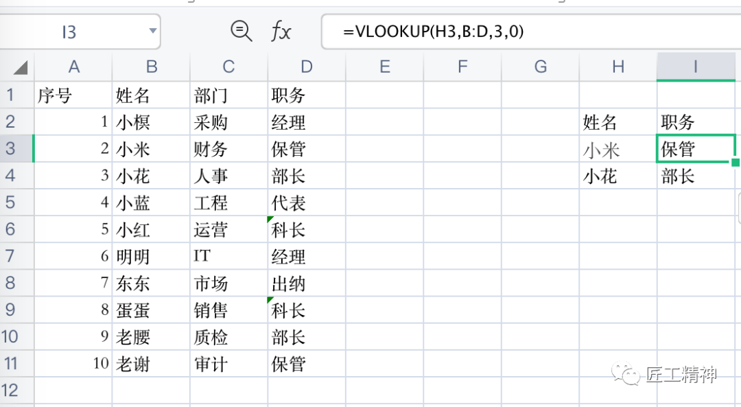 如图,需要从B~D的数据表中,根据H3单元格的姓名查询对应的职务。