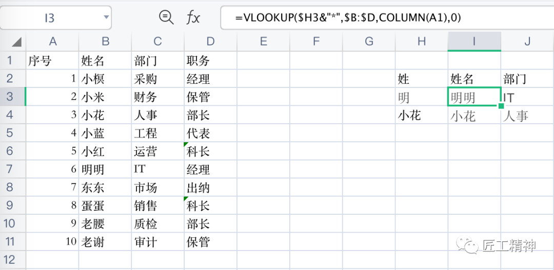 通配符“*”表示任意多个字符,VLOOKUP函数第一参数使用$H3&"*",即在C列中查询以H2单元格内容开头的内容,并返回对应列的信息。