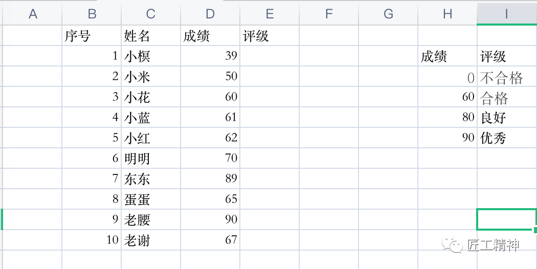 如图,需要根据H~I的对照表,判断D列成绩对应的评议结果。
