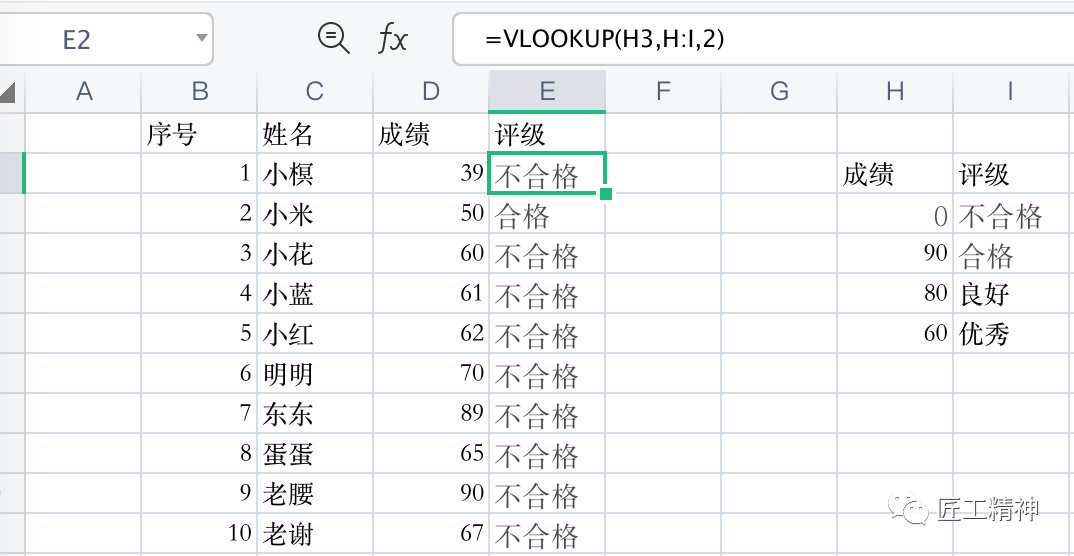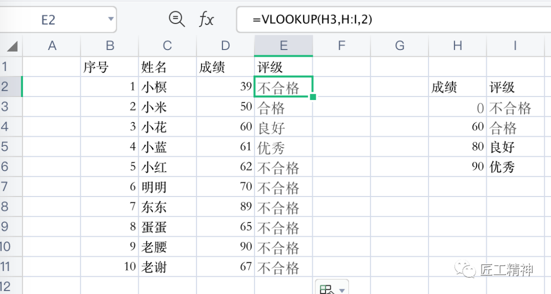 使用近似匹配时,查询区域的首列必须按升序排序,否则无法得到正确的结果,效果如下: