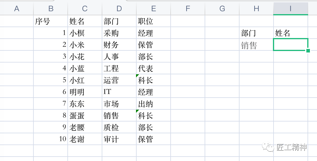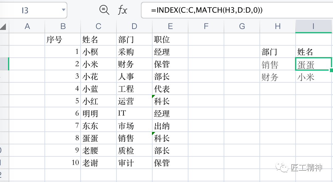 如图,需要从B~E的数据表中,根据H3单元格的部门,查询对应的姓名。