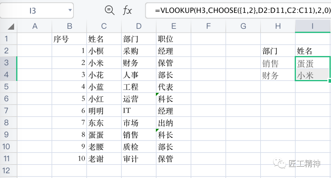 CHOOSE函数第一参数使用常量数组{1,2},将查询值所在的D2:D11和返回值所在的C2:C11整合成一个新的两列多行的内存数组。