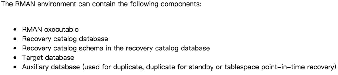 也就是说RMAN这个备份工具是由5个部分组成:可执行文件(executable)、恢复目录数据库(catalog)、目标数据库(target)、辅助数据库(auxiliary) 、恢复目录数据库中的恢复目录模式。这5个组件各自都有一个版本号,ORACLE用4位数表示RMAN组件的版本。
