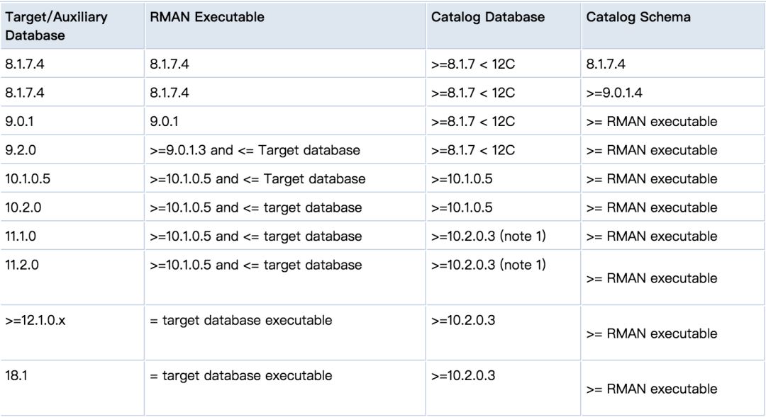 2、如果该版本号与数据库版本号兼容(参考表格),但是执行备份任务仍然有RMAN-10014错误,那么使用下面的命令检查RMAN 备份资料库的版本