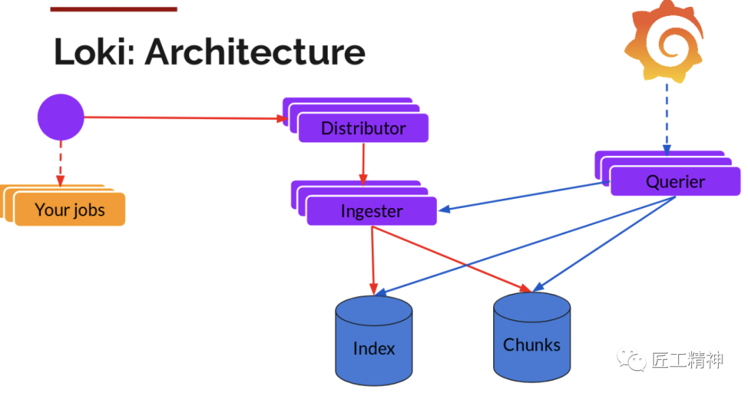 一旦promtail(官方用于搜集日志,推送到loki的组件)收集日志并将其发送给loki,Distributor就是第一个接收日志的组件。由于日志的写入量可能很大,所以不能在它们传入时将它们写入数据库。这会毁掉数据库。我们需要批处理和压缩数据。