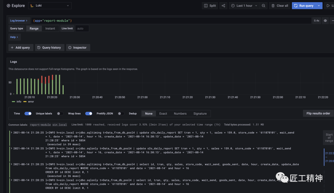 接下来导航到Explore,设置查询条件为{app="report-module"}