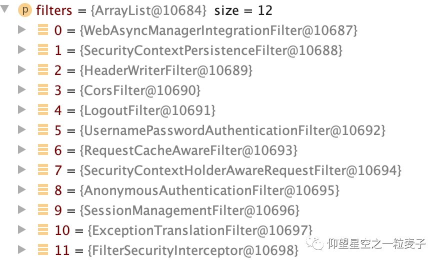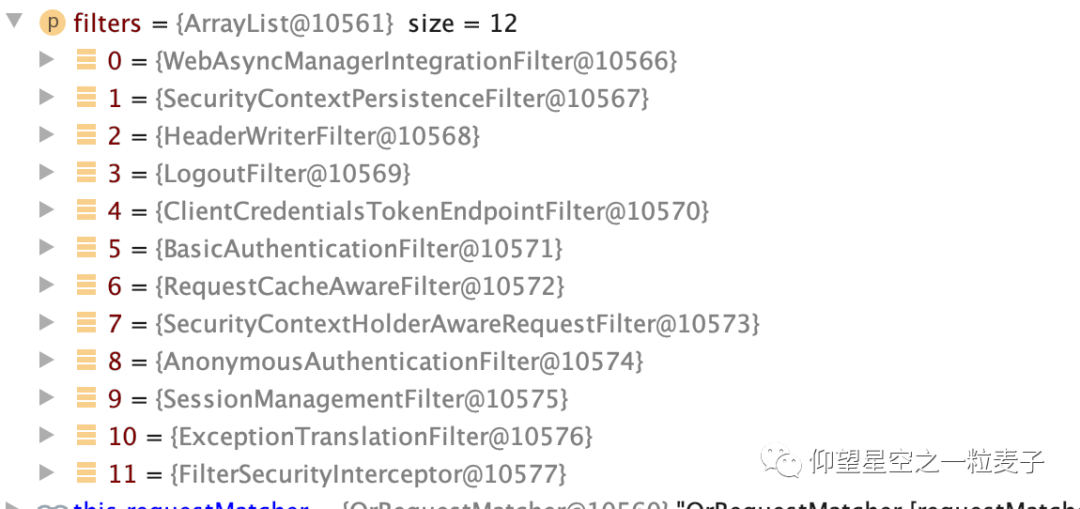 在我使用的版本中,一共有12个过滤器(DefaultSecurityFilterChain类中):