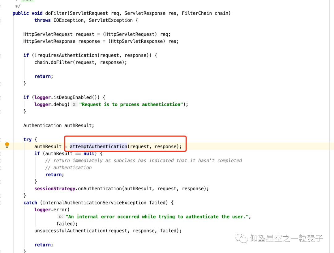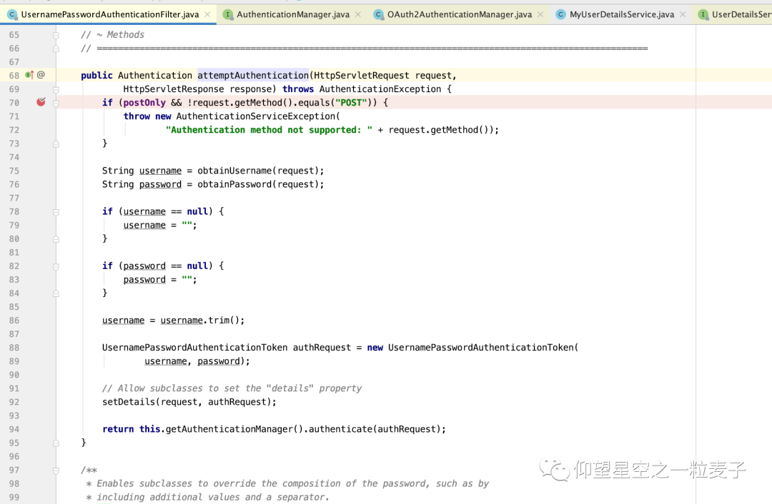 AbstractAuthenticationProcessingFilter.doFilter()调用UsernamePasswordAuthenticationFilter中的attemptAuthentication方法,