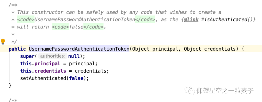其中super(null)调用的是父类的构造方法,传入的是权限集合,因为目前还没有认证通过,所以不知道有什么权限信息,这里设置为null,然后将用户名和密码分别赋值给principal和credentials,同样因为此时还未进行身份认证,所以setAuthenticated(false)