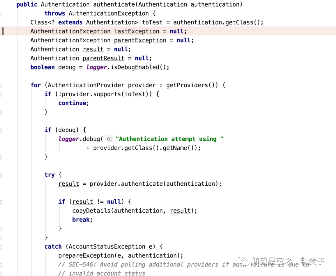 AuthenticationManager是用来管理AuthenticationProvider的接口,通过查找后进入,然后查看它的继承关系,找到ProviderManager实现类,它实现了AuthenticationManager接口,查看它的authenticate方法,它里面有段这样的代码: