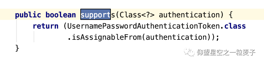接下来看AuthenticationProvider接口,就是进行身份认证的接口,它里面有两个方法:authenticate认证方法和supports是否支持某种类型token的方法,查看继承关系,找到AbstractUserDetailsAuthenticationProvider抽象类,它实现了AuthenticationProvider接口,它的supports方法如下: