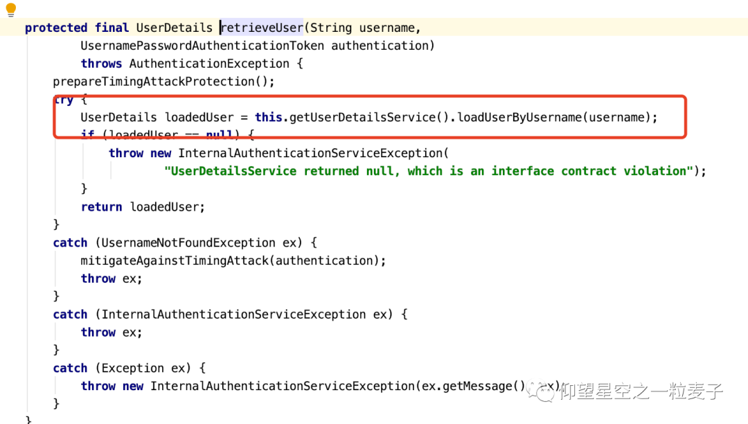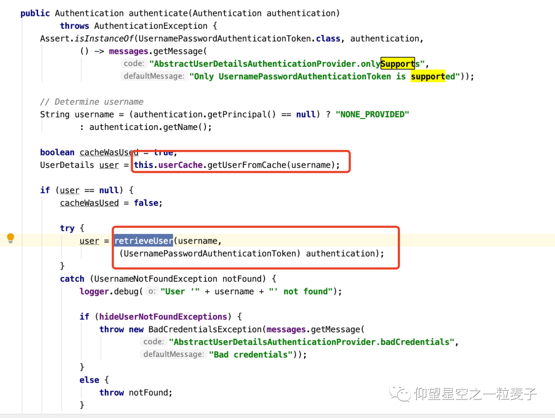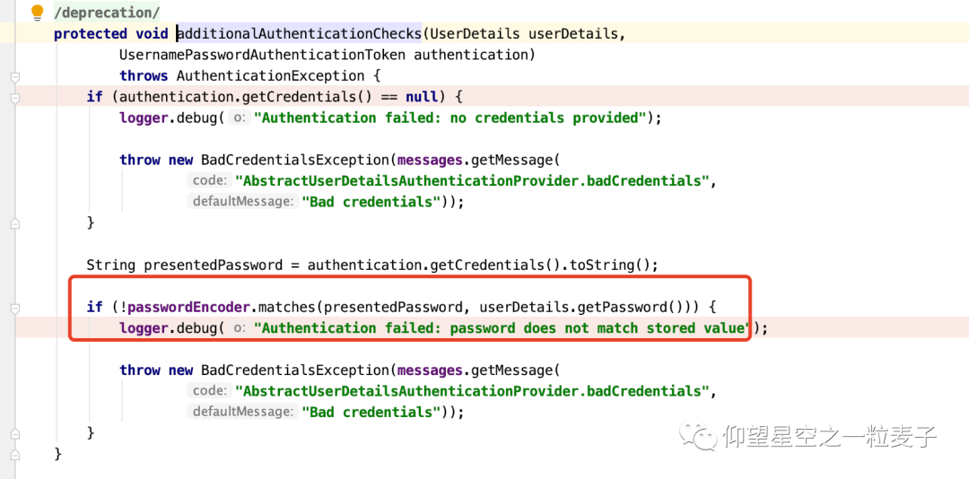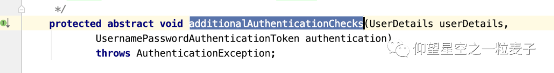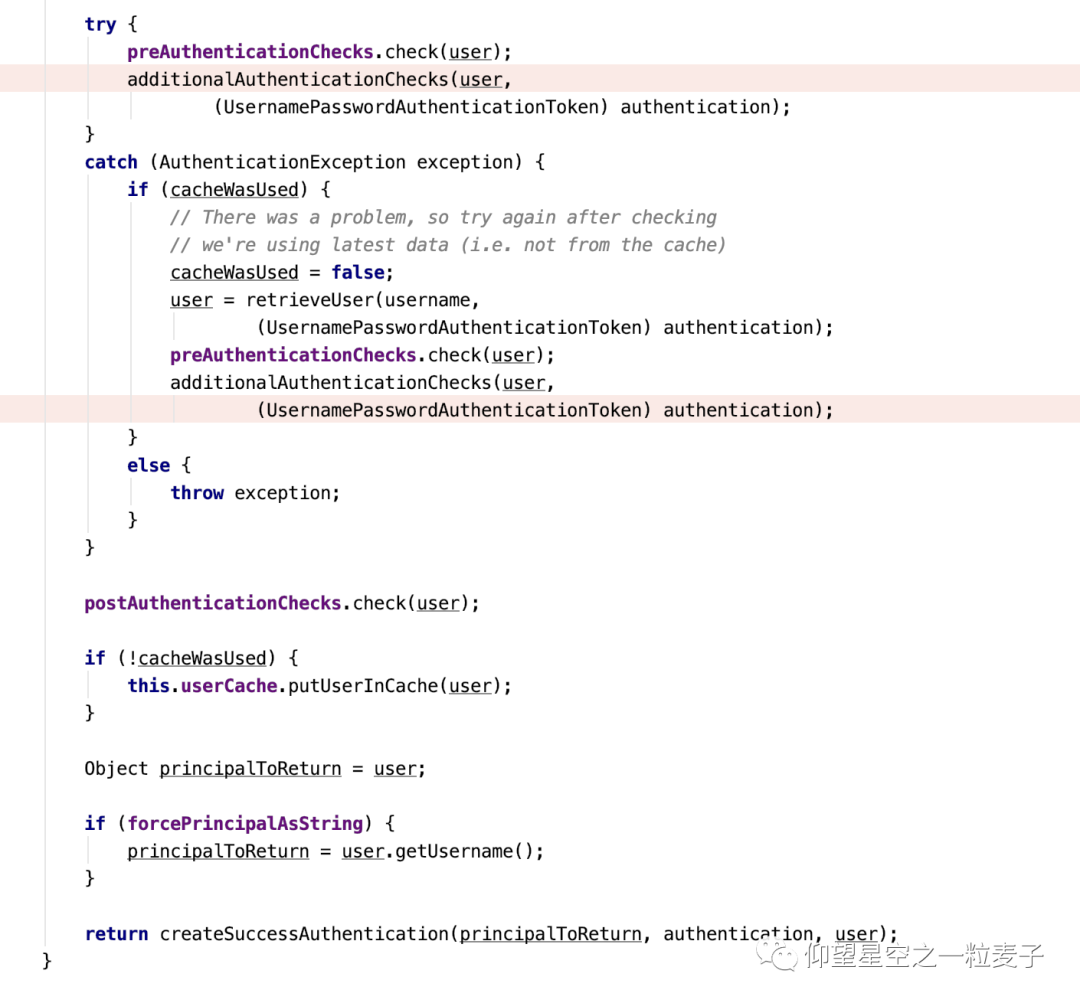 还是在AbstractUserDetailsAuthenticationProvider类里的authenticate的方法里,做了一些前置检查,后置检查,最后通过验证。这里面调用了additionalAuthenticationChecks 该方法,