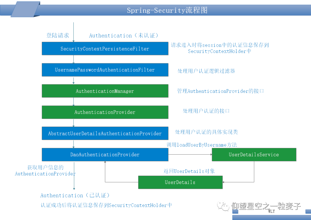 每一个过滤器的作用有兴趣的自行研究~看类名应该也能知道个大概。图二是默认启用的过滤器链,图三是因为我使用的是通过UsernamePasswordAuthenticationFilter来验证登录及授权的,我自定义实现了UserDetailsService。这也是我接下来要介绍的重点,用户名密码验证流程: