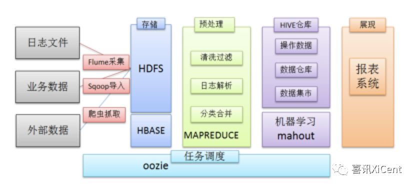 除了hdfs+mapreduce(或spark)+hive组成分析系统的核心之外,还需要数据采集、结果数据导出、任务调度等不可或缺的辅助系统,