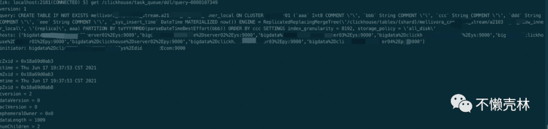 这个日志中的信息:版本号、执行的语句、需要执行该语句的hosts列表。其它节点监听到此操作日志后,后判断自己是否在该hosts列表内,如果包含,则进入执行流程,执行完毕后写入/clickhouse/task_queue/ddl/query-0000107349/finished