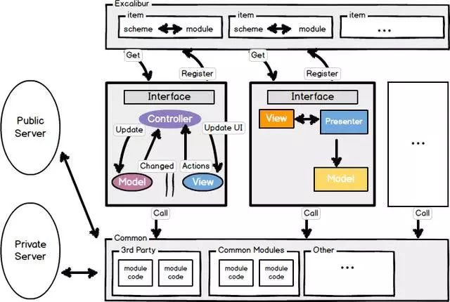 对于业务的组件化,我们采取了业务模块注册机制的方式来达到解耦合的目的。每个业务模块对外提供相应的业务接口,同时在系统启动的时候向Excalibur系统注册自己模块的Scheme(Excalibur是饿了么移动用来保存Scheme与模块之间映射的系统,同时能根据Scheme进行Class反射返回)。