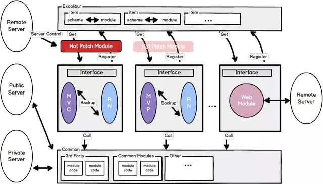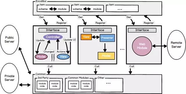 这种E(Excalibur)M(Modules)C(Common)架构以高内聚、低耦合为主要的特点,以面向接口编程为出发点,降低了模块与模块之间的联系。