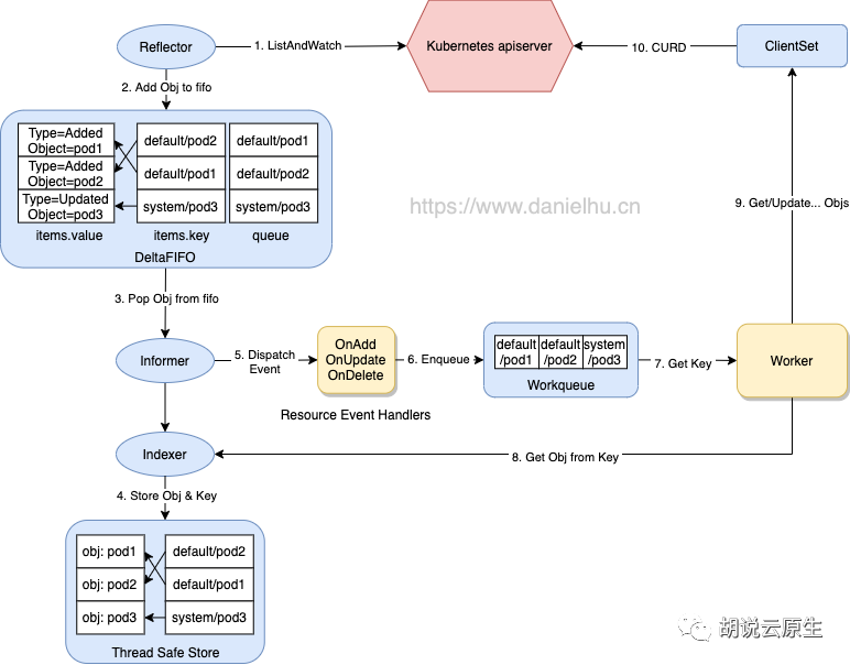 DeltaFIFO 和 Indexer 之间还有一个桥梁 Informer,我们这里简单提到了 sharedIndexInformer 的 HandleDeltas() 方法,后面详细分析 Informer 的逻辑,最终再将整个自定义控制器和 client-go 相关组件逻辑串在一起。