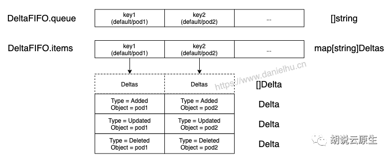 DeltaFIFO 内部主要维护的一个队列和一个 map,直观一点表示如下: