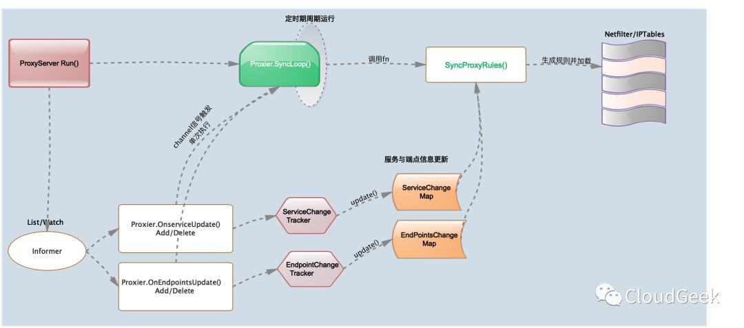 Iptables-mode proxier的负载均衡机制是通过底层netfliter/iptables规则来实现的,通过Informer机制watch服务与端点信息的变更事件触发对iptables的规则的同步更新,如下代码逻辑示意图: