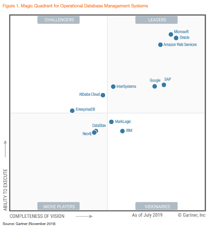 在2019年的Gartner全球数据库魔力象限评选中,AWS、微软、阿里云、谷歌云都出现在了这个榜单中,而且微软云和亚马逊azure已经紧逼传统巨头oracle,在领导者象限齐头并进。同时阿里云已经连续两年入选数据库魔力象限,2019年还首次入选挑战者象限,距离领导者象限只有一步之遥。随着阿里云、谷歌等云厂商强势上升,IBM、SAP则出现了明显下滑,IBM从领导者象限滑首次落至远见者象限。