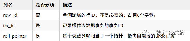 对于InnoDB存储引擎,每一行记录都有两个隐藏列trx_id、roll_pointer,如果表中没有主键和非NULL唯一键时,则还会有第三个隐藏的主键列row_id。