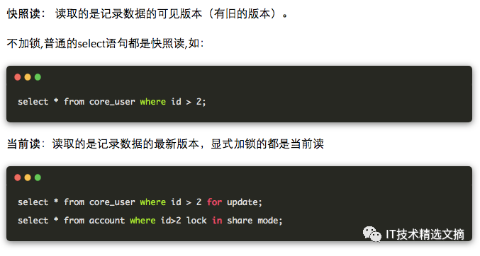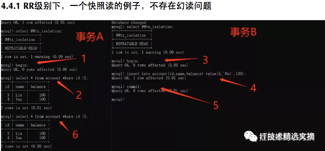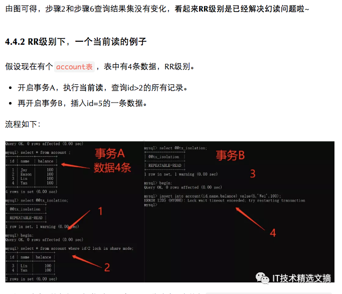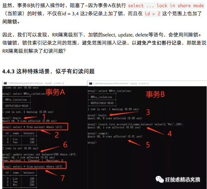 其实,上图事务A中,多加了update account set balance=200 where id=5;这步操作,同一个事务,相同的sql,查出的结果集不同了,这个结果,就符合了幻读的定义~