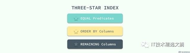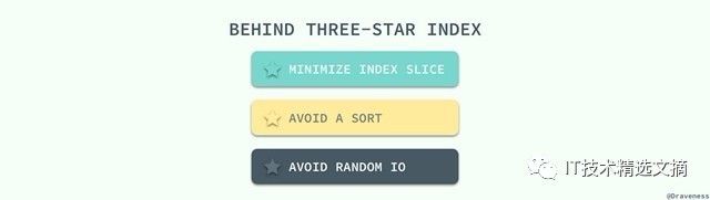 如果对于一个查询语句我们依照上述的三个条件进行设计,那么就可以得到该查询的三星索引,这三颗星中的最后一颗星往往都是最容易获得的,满足第三颗星的索引也就是上面提到的宽索引,能够避免大量的随机 IO,如果我们遵循这个顺序为一个 SQL 查询设计索引那么我们就可以得到一个完美的索引了;这三颗星的获得其实也没有表面上这么简单,每一颗星都有自己的意义: