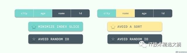在上述查询中,我们总可以通过增加索引中的列以获得第三颗星,但是如果我们想要获得第一颗星就需要最小化索引片的大小,这时索引的前缀必须为 (city, age),在这时再想获得第三颗星就不可能了,哪怕在 age 的后面添加索引列 name,也会因为 name 在范围索引列 age 后面必须进行一次排序操作,最终得到的索引就是 (city, age, name, id):