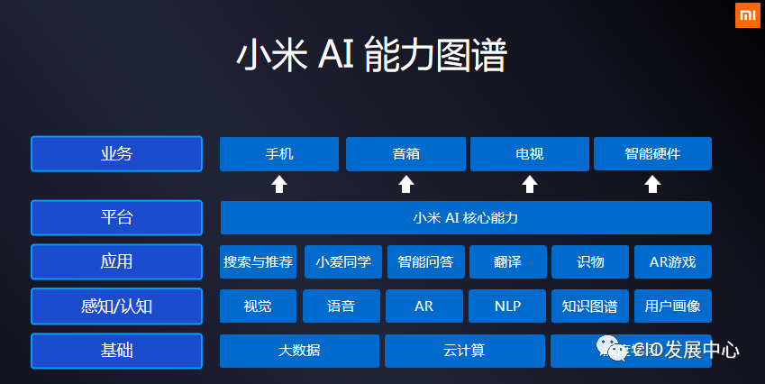算法:小米研究了六大算法研究方向,在基础支撑层有知识图谱、机器学习,机器学习是人工智能最核心的算法环节。在基础能力层覆盖了视觉、声学、语音、自然语言处理。
