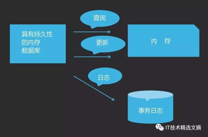 您可能会注意到的第一件事是,即使您这个很好的快速的内存数据库具有持久性,但它的查询不会慢,因为它仍然只能像内存数据库那样仅仅占用主内存。 这是好消息! 但是更新呢? 每个更新(我们称之为事务)应该不仅应用于内存,而且还要持久到一个缓慢的磁盘上 。这会是问题吗? 我们来看下图: