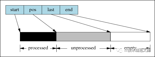 一般buffer结构体可以表示一块内存,内存的起始和结束地址分别用start和end表示,pos和last表示实际的内容。如果内容已经处理过了,pos的位置就可以往后移动。如果读取到新的内容,last的位置就会往后移动。所以buffer可以在多次调用过程中使用。如果last等于end,就说明这块内存已经用完了。如果pos等于last,说明内存已经处理完了。下面是一个简单的示意图,说明buffer中指针的用法: