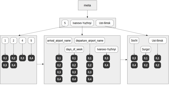 2. 在元素树中找到提取的键,并为每个键选择TID列表:对于«5»—(0,4),对于«days_of_week»—(0,1),(0,2 ),(0,3),(0,4)。