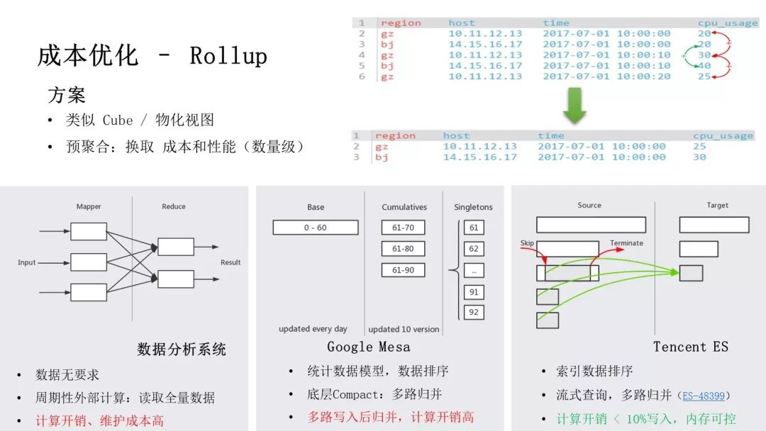 硬盘成本方面,由于数据具有明显的冷热特性,首先我们采用冷热分离架构,使用混合存储的方案来平衡成本、性能;其次,既然对历史数据通常都是访问统计信息,那么以通过预计算来换取存储和性能,后面会展开介绍;如果历史数据完全不使用,也可以备份到更廉价的存储系统;其他一些优化方式包含存储裁剪、生命周期管理等。