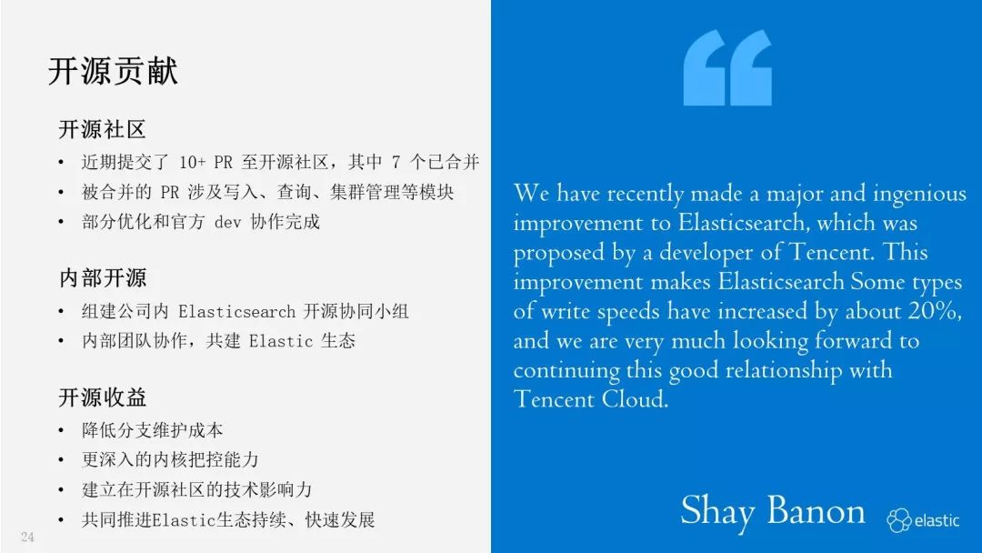 总体来说,开源的收益利大于弊,我们把相应收益反馈出来,希望更多同学参与到 Elastic 生态的开源贡献中:首先,开源可以降低分支维护成本,随着自研的功能越来越多,维护独立分支的成本越来越高,主要体现在与开源版本同步、快速引入开源新特性方面;其次,开源可以帮助研发同学更深入的把控内核,了解最新技术动态,因为在开源反馈的过程中,会涉及与官方开发人员持续的交互。此外,开源有利于建立大家在社区的技术影响力,获得开源社区的认可。最后 Elastic 生态的快速发展,有利于业务服务、个人技术的发展,希望大家一起参与进来,助力 Elastic 生态持续、快速的发展。