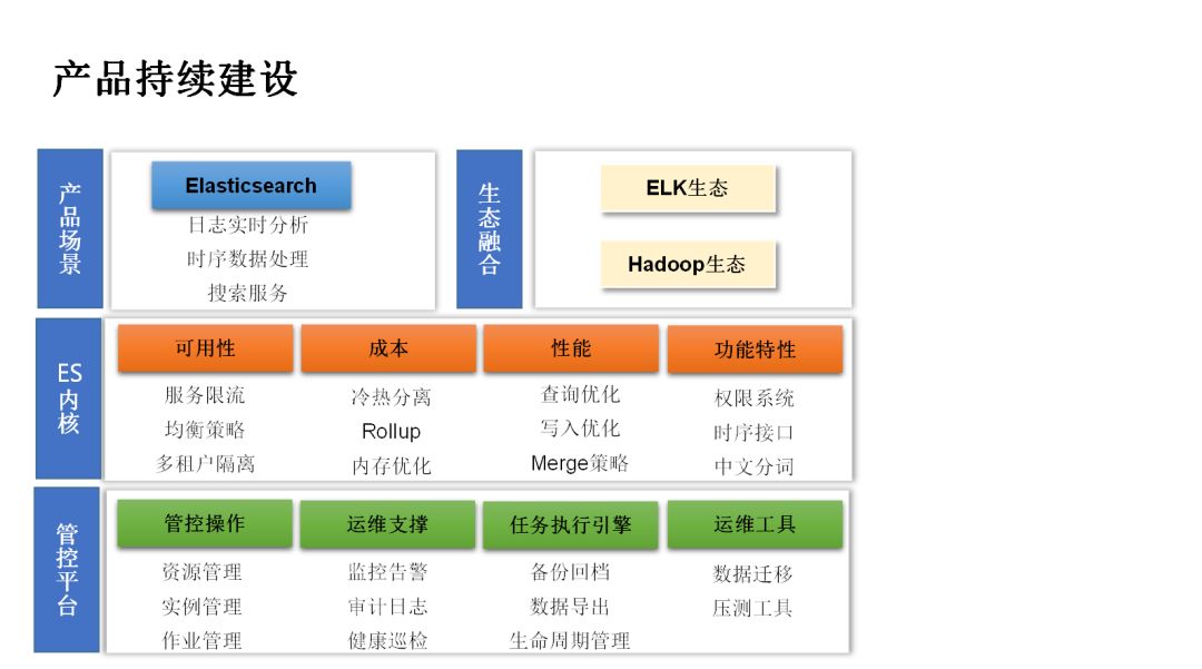 未来规划方面,这次分享我们重点介绍了腾讯在 ES 内核方面的优化实践,包含高可用、低成本、高性能等方面。此外,我们也提供了一套管控平台,支持线上集群自动化管控、运维,为腾讯云客户提供 ES 服务。但是从线上大量的运营经验分析,我们发现仍然有非常丰富、高价值的方向需要继续跟进,我们会持续继续加强对产品、内核的建设。
