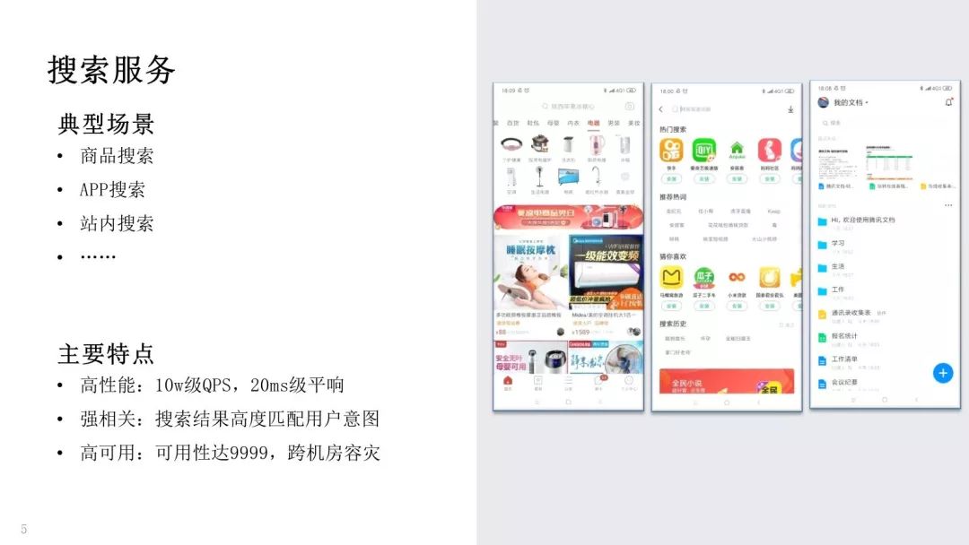 第二类使用场景是搜索服务,典型场景包含:商品搜索,类似京东、淘宝、拼多多中的商品搜索;APP 搜索,支持应用商店里的应用搜索;站内搜索,支持论坛、在线文档等搜索功能。我们支持了大量搜索服务,它们主要有以下特点: