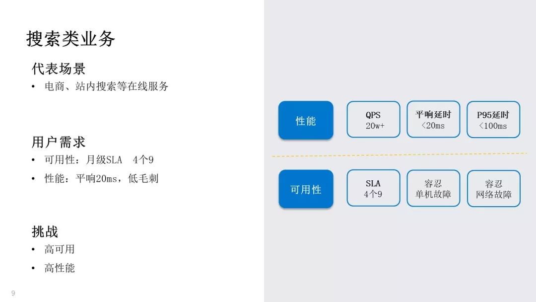 首先,我们一起看看搜索类业务的挑战。以电商搜索、APP 搜索、站内搜索为代表,这类业务非常重视可用性,服务 SLA 达到 4 个 9 以上,需要容忍单机故障、单机房网络故障等;同时要求高性能、低毛刺,例如 20w QPS、平响 20ms、P95 延时 100ms。总之,在搜索类业务场景下,核心挑战点在于高可用、高性能。