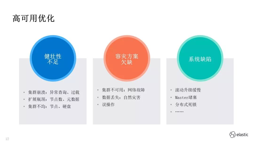 系统健壮性:是指 ES 内核自身的健壮性,也是分布式系统面临的共性难题。例如,在异常查询、压力过载下集群的容错能力;在高压力场景下,集群的可扩展性;在集群扩容、节点异常场景下,节点、多硬盘之间的数据均衡能力。