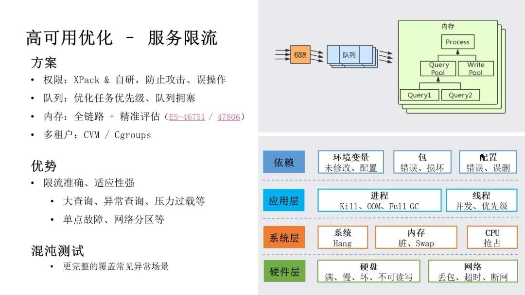 这里我们展开介绍下服务限流部分。我们做了 4 个层级的限流工作:权限层级,我们支持 XPack 和自研权限来防止攻击、误操作;队列层级,通过优化任务执行速度、重复、优先级等问题,解决用户常遇到的 Master 任务队列堆积、任务饿死等问题;内存层级,我们从 ES 6.x 开始,支持在 HTTP 入口、协调节点、数据节点等全链路上进行内存限流,同时使用 JVM 内存、梯度统计等方式精准控制;多租户层级,我们使用 CVM/Cgroups 方案保证多租户间的资源隔离。