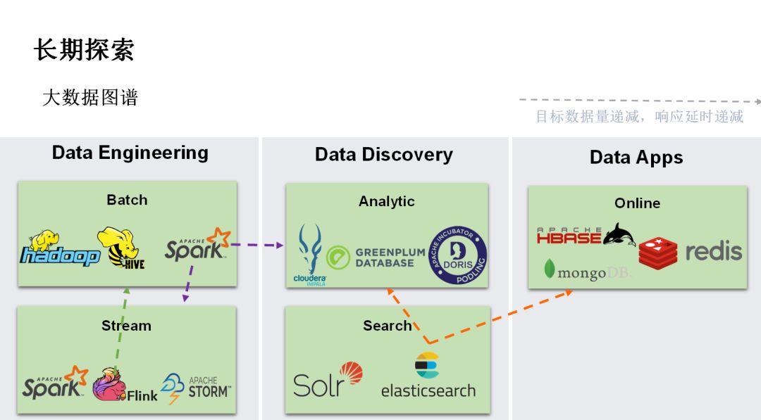 长期探索方面,我们结合大数据图谱来介绍。整个大数据领域,按照数据量、延时要求等特点,可以划分为三部分:第一部分是 Data Engineering,包含我们熟悉的批量计算、流式计算;第二部分是 Data Discovery,包含交互式分析、搜索等;第三个部分是 Data Apps,主要用于支撑在线服务。