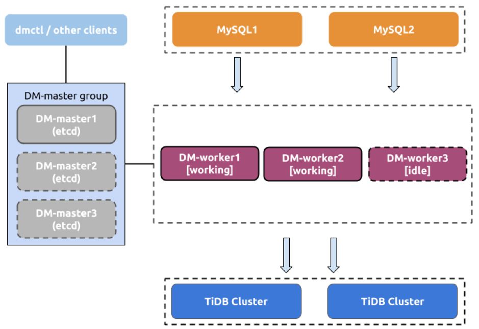 让 TiDB 自研的 DM(从 MySQL 迁移数据到 TiDB 的工具) 支持了高可用的特性,使得用户免于遭受在节假日甚至凌晨发现挂掉一台服务器而紧急 OnCALL 的苦恼,也为 DM 可以用在一些关键场景中做了铺垫。