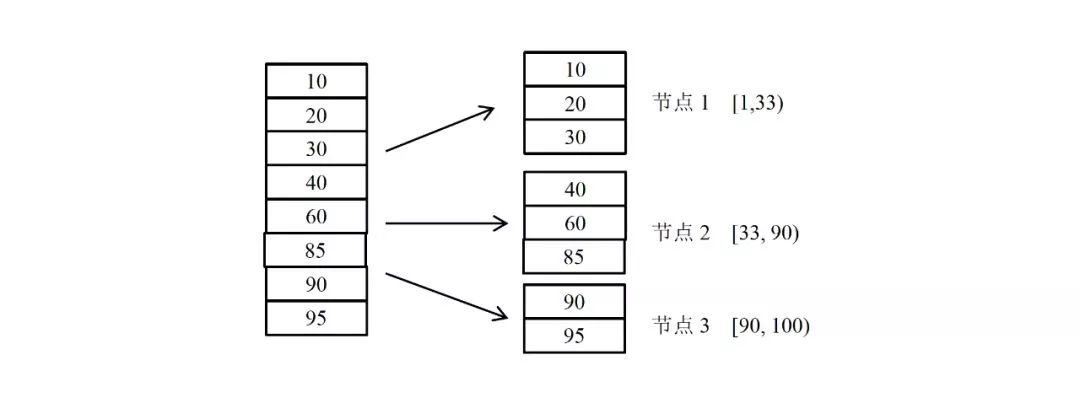 按数据范围分布是另一个常见的数据分布式,将数据按特征值的值域范围划分为不同的区间,使得集群中每台(组)服务器处理不同区间的数据。