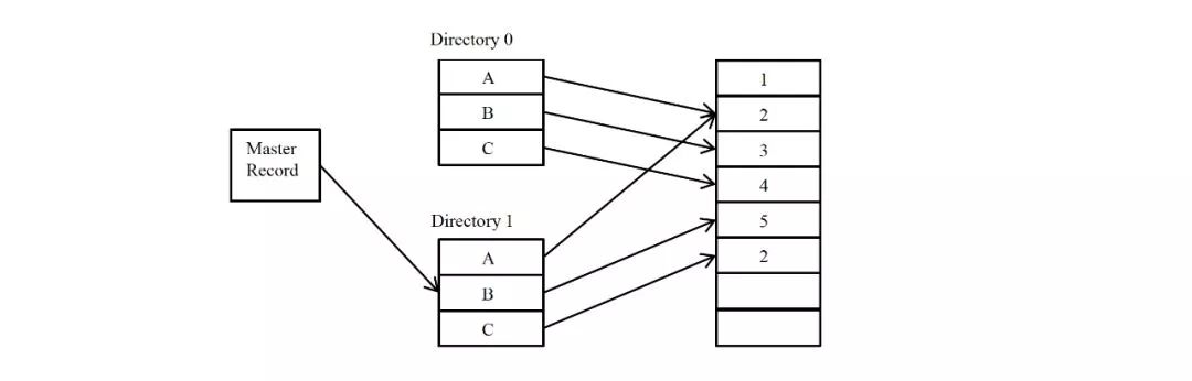 0/1 目录技术中有两个目录结构,称为目录0(Directory 0)和目录1(Directory 1)。另有一个结构称为主记录(Master record)记录当前正在使用的目录称为活动目录。主记录中要么记录使用目录0,要么记录使用目录1。目录0 或目录1 中记录了各个数据的在日志文件中的位置。0/1 目录的数据更新过程始终在非活动目录上进行,只是在数据生效前,将主记录中的0、1 值反转,从而切换主记录。