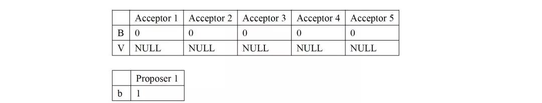 基本例子里有5 个Acceptor,1 个Proposer,不存在任何网络、宕机异常。我们着重考察各个Accpetor 上变量B 和变量V 的变化,及Proposer 上变量b 的变化。