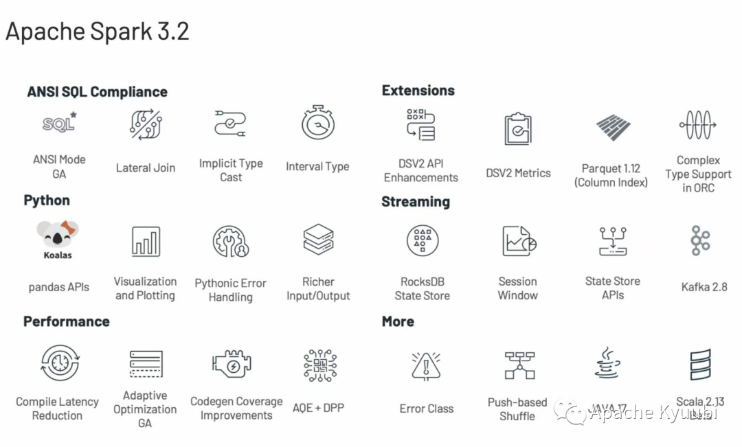 在这个版本中,Spark 进行了在 API 层对 Pandas API 进行了友好的支持。得益于此,Pandas 用户只需修改一行代码就可以将原本的应用跑在Spark上,获得分布式横向扩展的能力。除此之外,这个版本还囊括了一下主要更新: