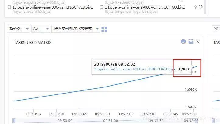 图中可以看到多个机器大概在10点初时,出现了线程数大量飙升,甚至超出了虚拟化平台对容器的2000线程数限制(平台为了避免机器上的部分容器线程数过高,导致机器整体夯死而设置的熔断保护),因此实例是被虚拟化平台kill了。之前为什么之前在南京机房小流量上线的时候没出现线程数超限的问题,应该和南京机房流量较少,只有北京机房流量的1/3有关。