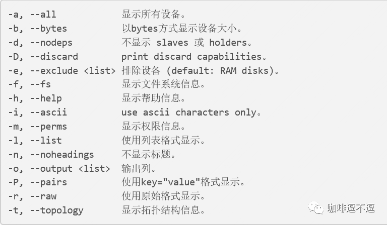 lsblk命令用于列出所有可用块设备的信息,而且还能显示他们之间的依赖关系,但是它不会列出RAM盘的信息。块设备有硬盘,闪存盘,cd-ROM等等。选项如下: