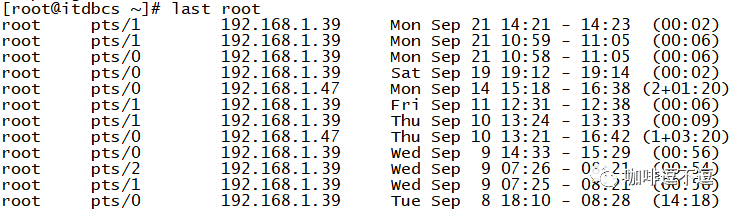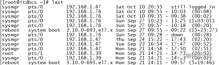 借助last命令,我们就能观察用户在系统中的活动;该命令还可以以正常用户的身份来执行,它会显示完整的用户信息,比如终端、时间、日期、系统重启或启动以及内核版本,这是用来排查故障的实用命令。